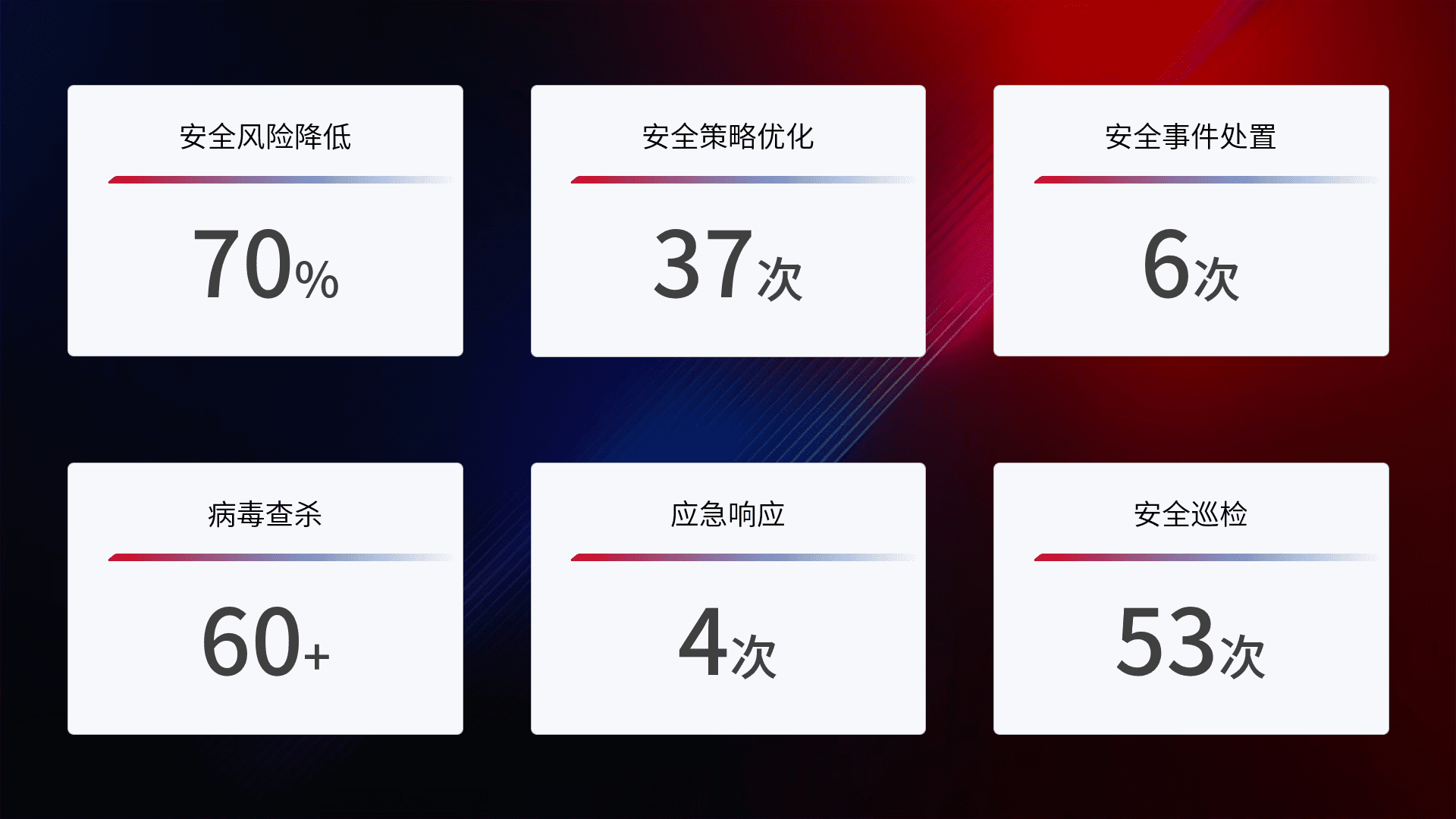 提供全面的安全事件报告体系,,包括处置报告、、、周报、、、、季度和年度总结,,,结合持续监控,,,帮助客户深入了解网络安全状况。。