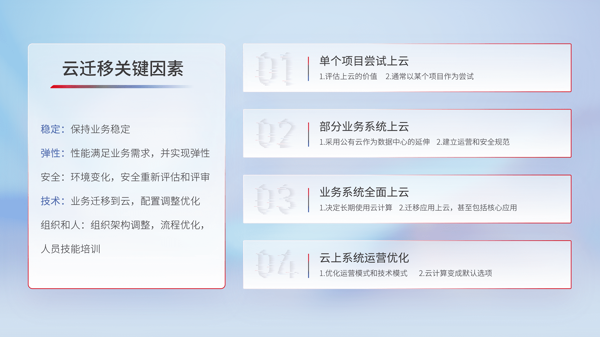 结合实际业务,,,从规划设计、、、、云平台选型、、、、云原生改造、、数据迁移、、、集成交付,,,,迁移全过程为客户识别最佳上云路径,,,做好风险识别管理,,,,设计网络架构、、身份权限、、安全审计合规、、、、操作审计、、、日志审计、、监控告警策略、、、、多站点容灾设计等,,,对云上基础设施进行整体规划,,,提升IT治理水平,,以满足弹性、、高可用、、高性能的需求。。。。