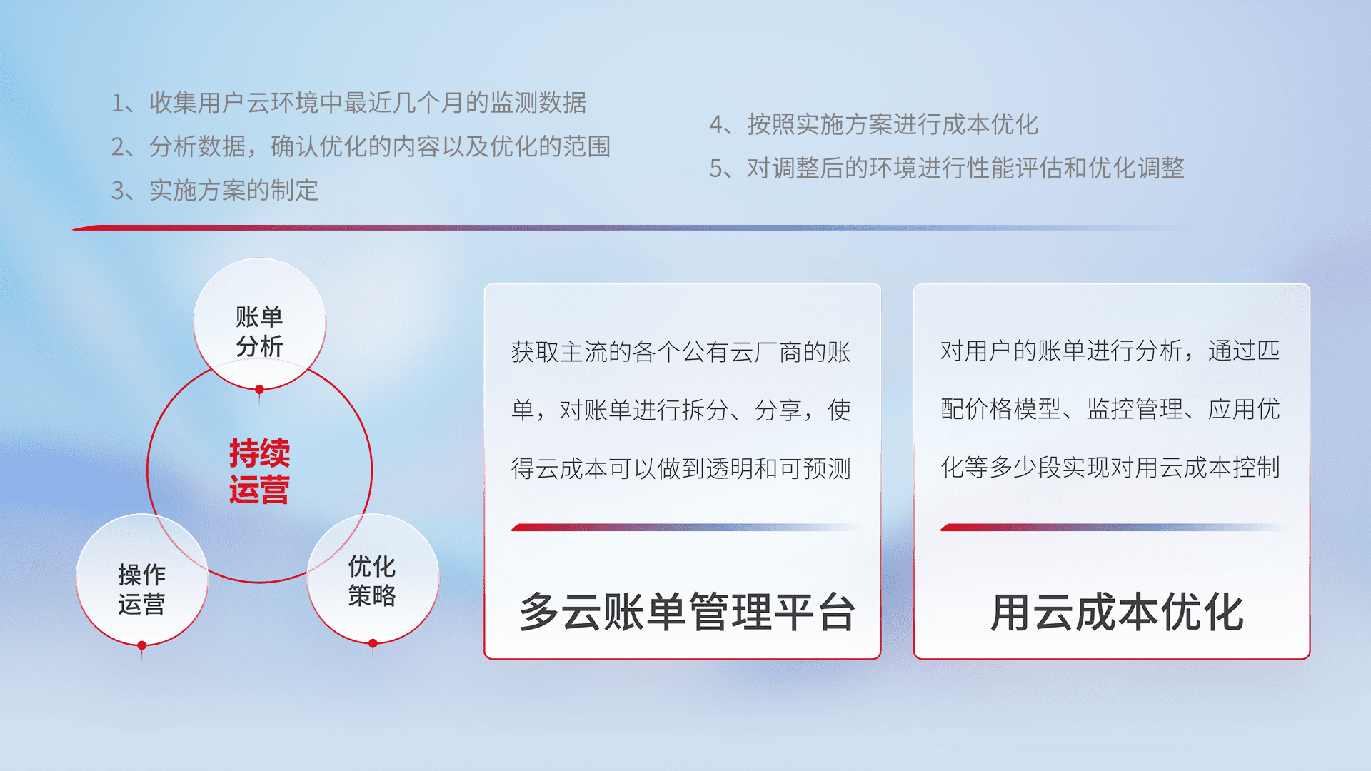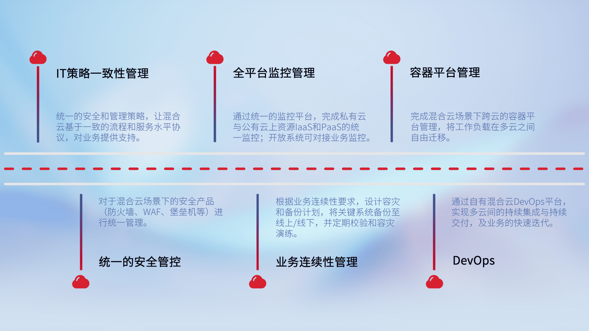通过多云纳管,,以统一的资源数据模型把客户的云资源进行抽象和封装,,进而实现对多云资源的统一操作,,,,保障云资源管理的可靠性、、、、稳定性与可用性。。量身定制化运维内容,,配置、、、、开发运维、、、、补丁管理、、、、备份、、、监控、、、、认证和访问管理、、审计和日常巡检等,,,,保障在用云过程中的可靠度,,稳定度以及高可用率。。